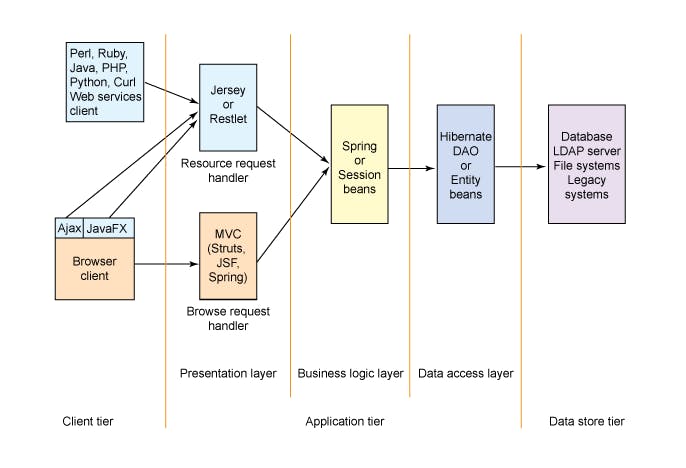 각 계층이 후속 계층 외부에서 상호 작용할 수 없는 구성 요소인 클라이언트-서버 시스템에 추가 계층이 있음.
